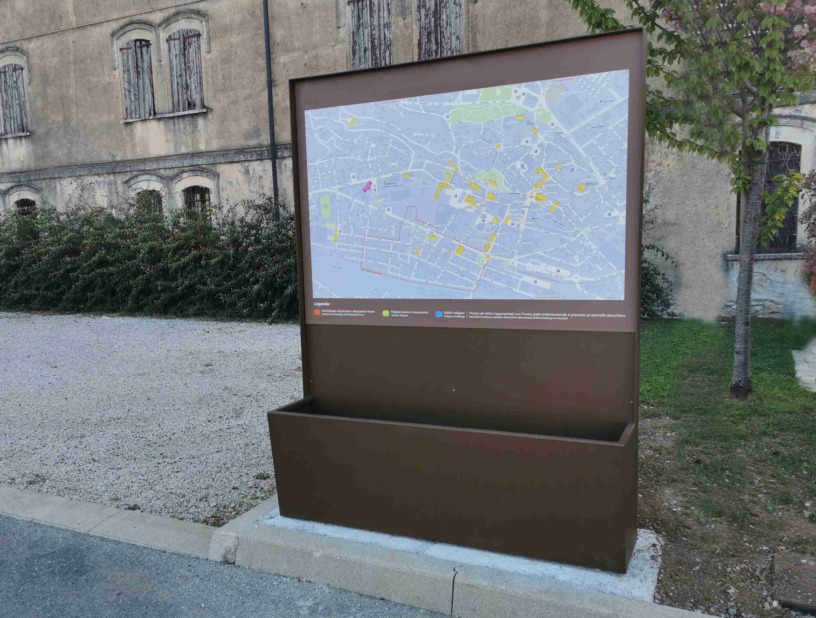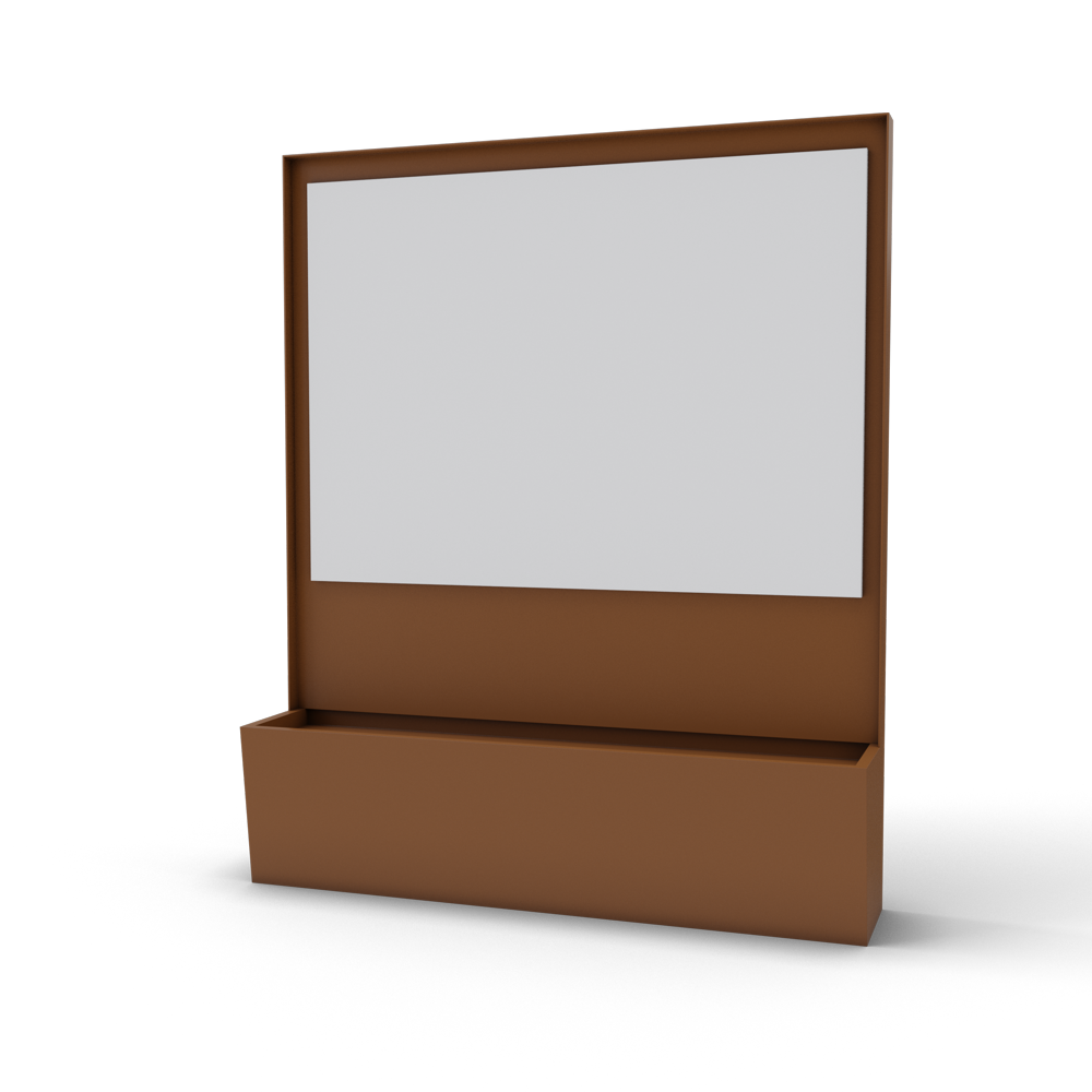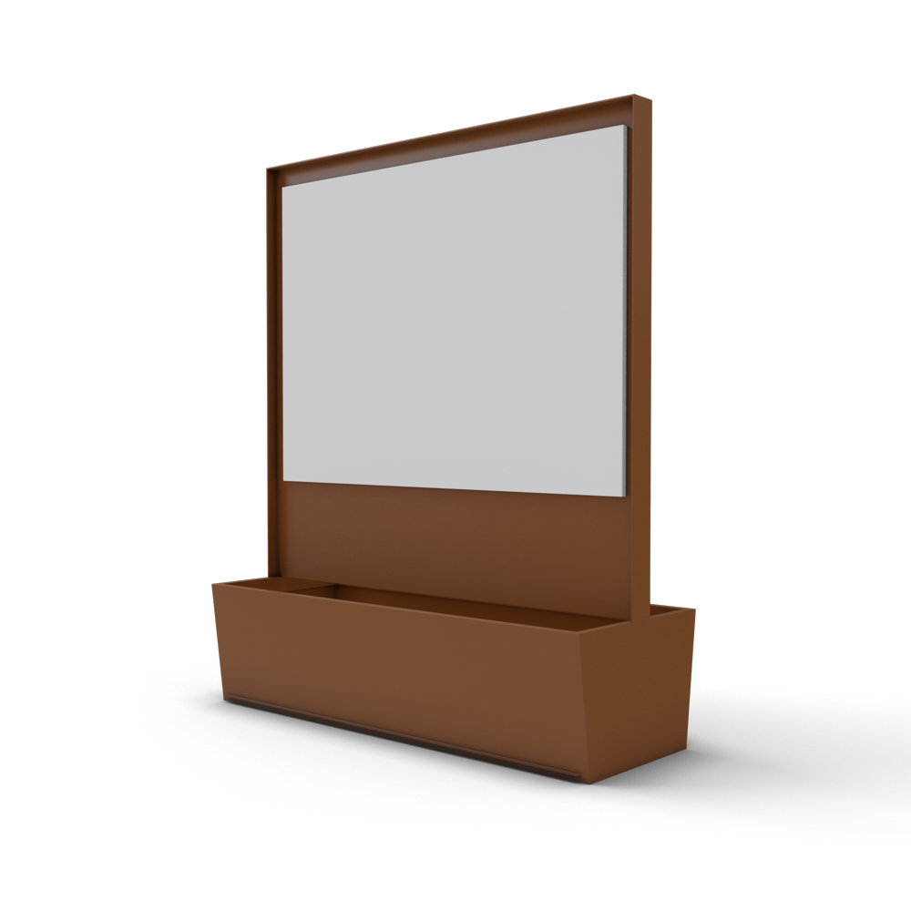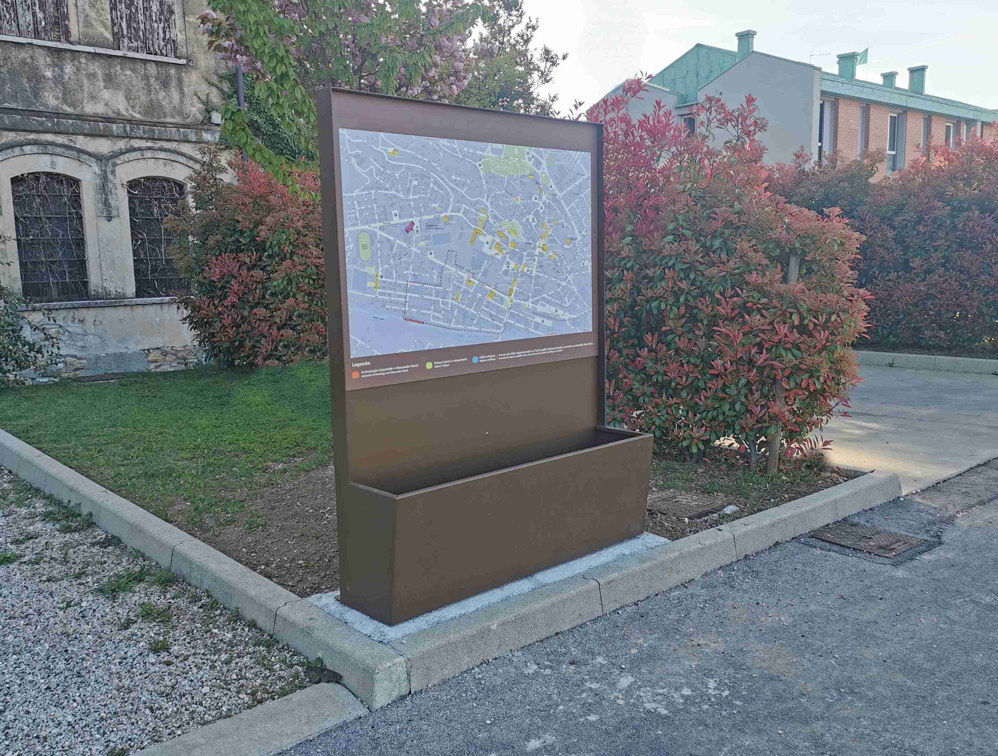 Bacheca monofacciale dotata di fioriera alla base, ideale per punti di informazione con un tocco di verde.