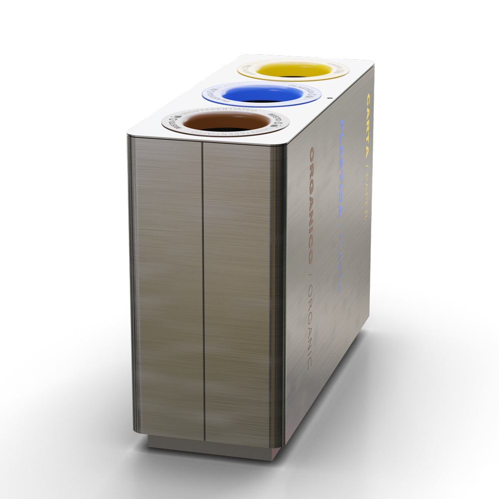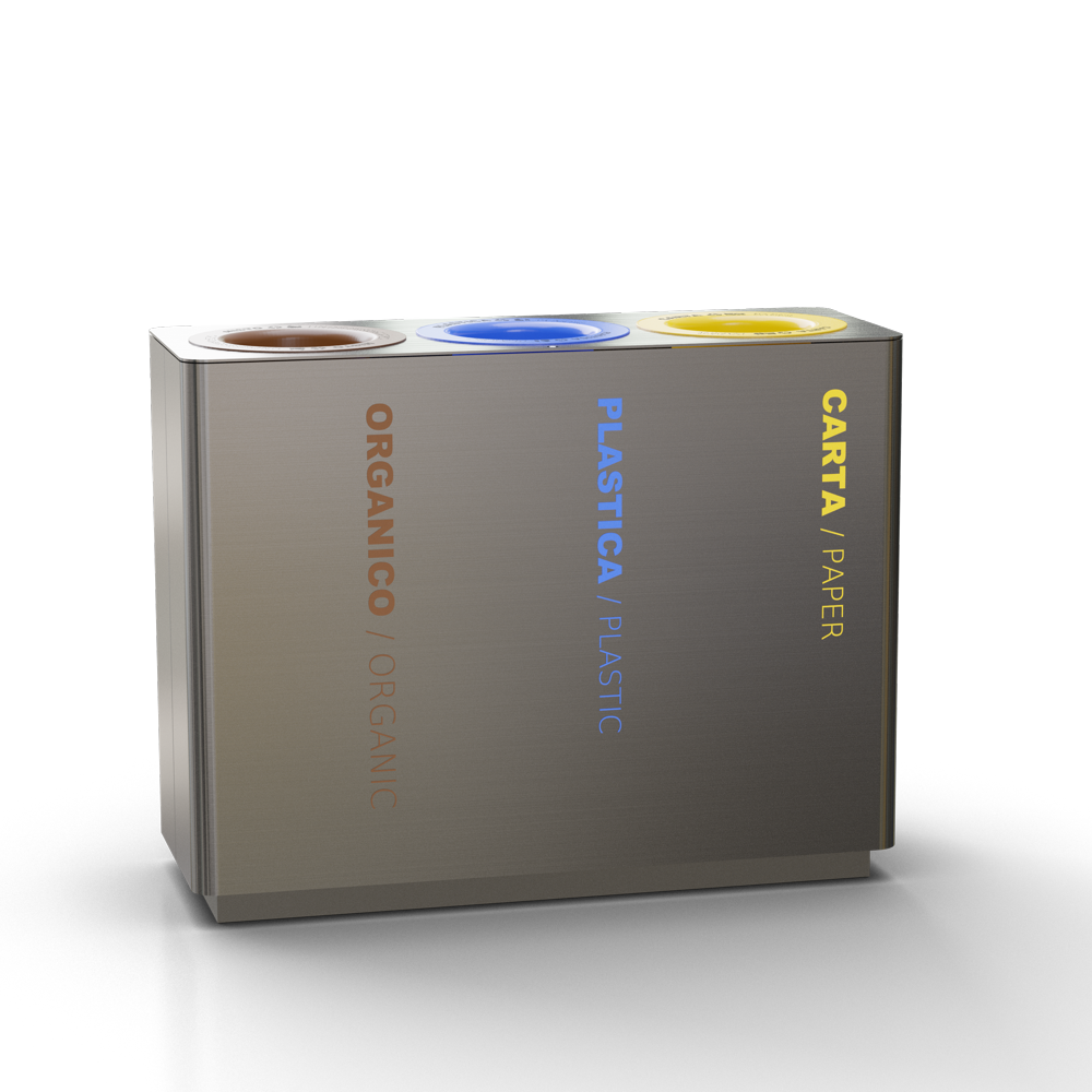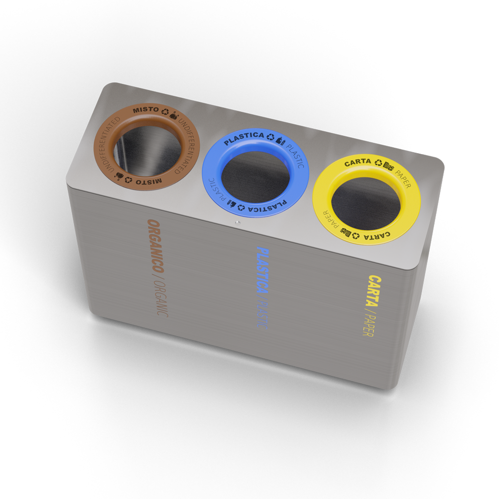 Collezione di cestini da interno idonei per la raccolta differenziata. Disponibili con tre o quattro contenitori interni e grafiche personalizzabili. Rivestimento esterno in acciaio inox e anelli convogliatori in lamiera verniciata.