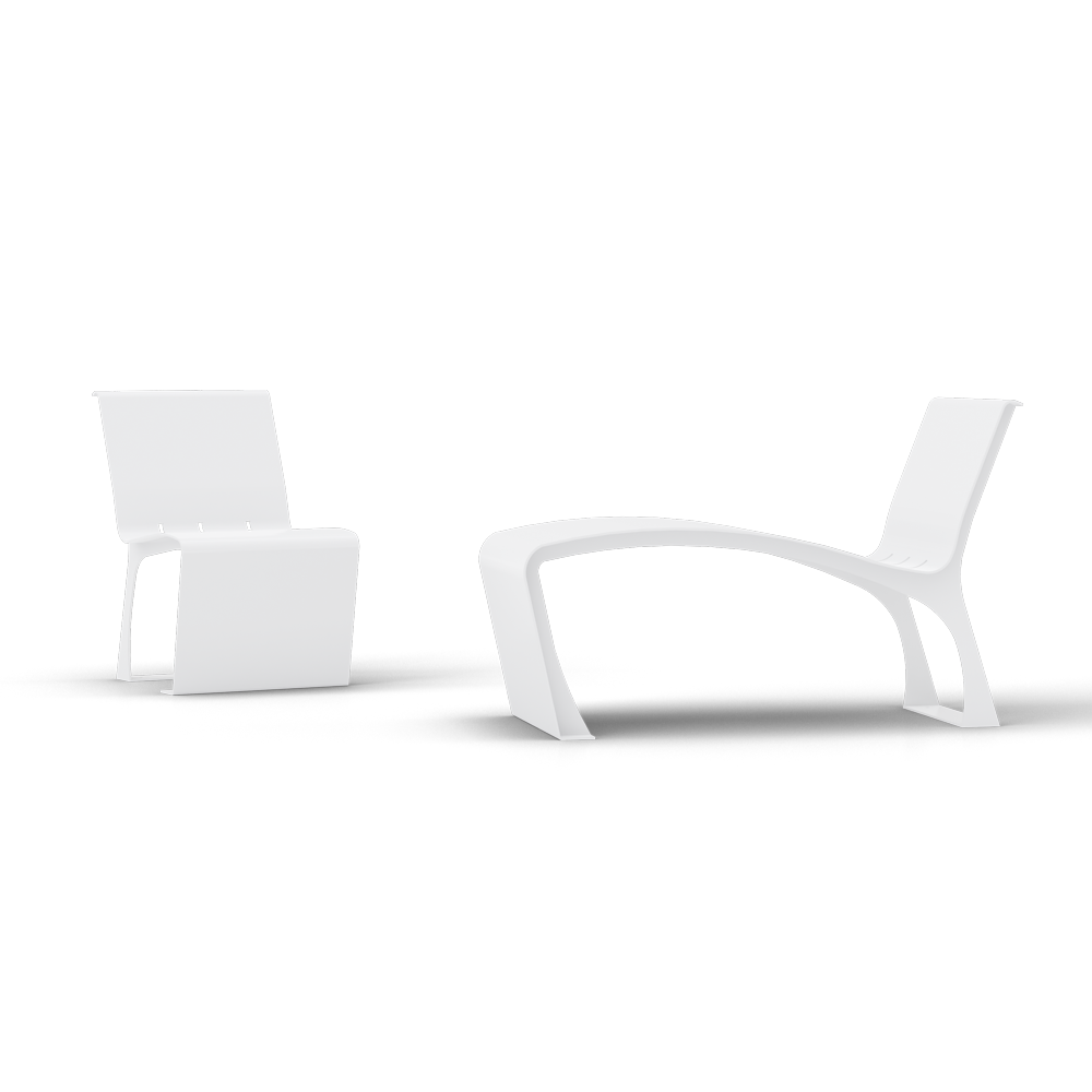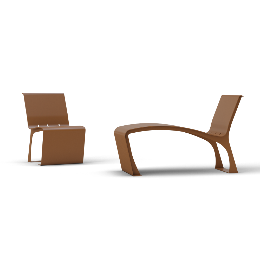 Panchina in metallo verniciato a polveri dalle linee neoliberty che assieme al modello chaise longue è adatta a creare salotti urbani o aree relax.