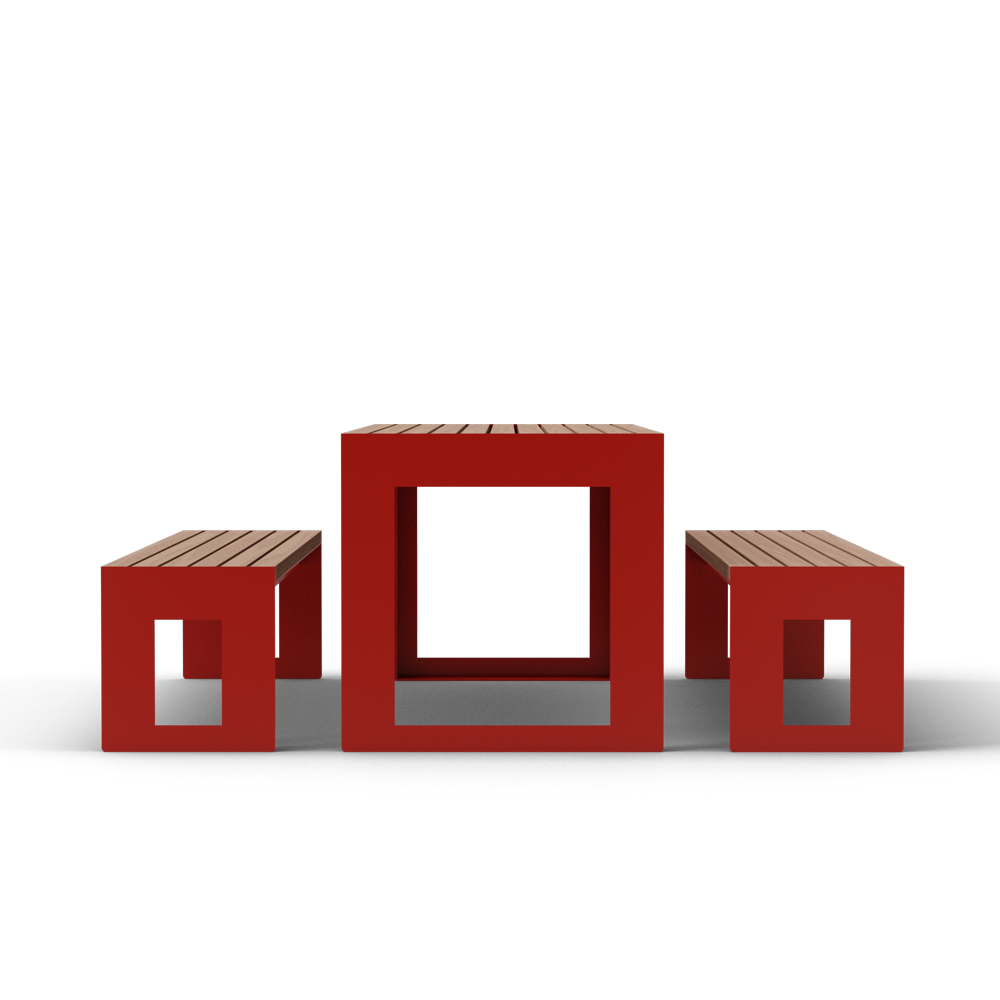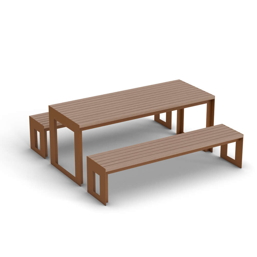 Tavolo con panche abbinate, caratterizzato da una struttura metallica solida e duratura. La seduta è realizzabile in legno o wpc. Ideale dove si predilige un aspetto estetico pulito e grande robustezza per un prodotto duraturo nel tempo.